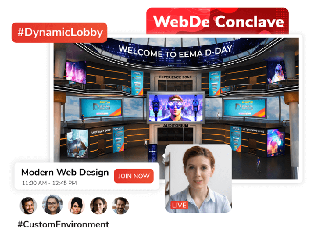 • Custom Environment lets you be the boss of your event, empowering you to customise every aspect of your virtual conference to make it into the most breathtaking as well as professional layout.